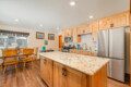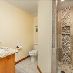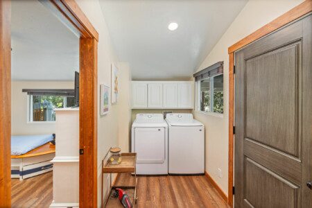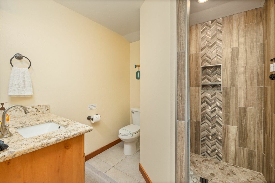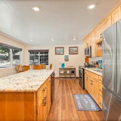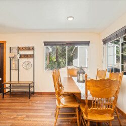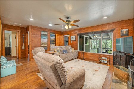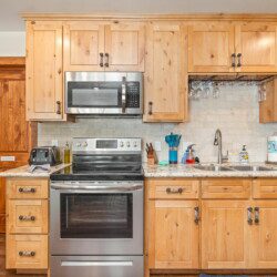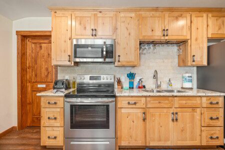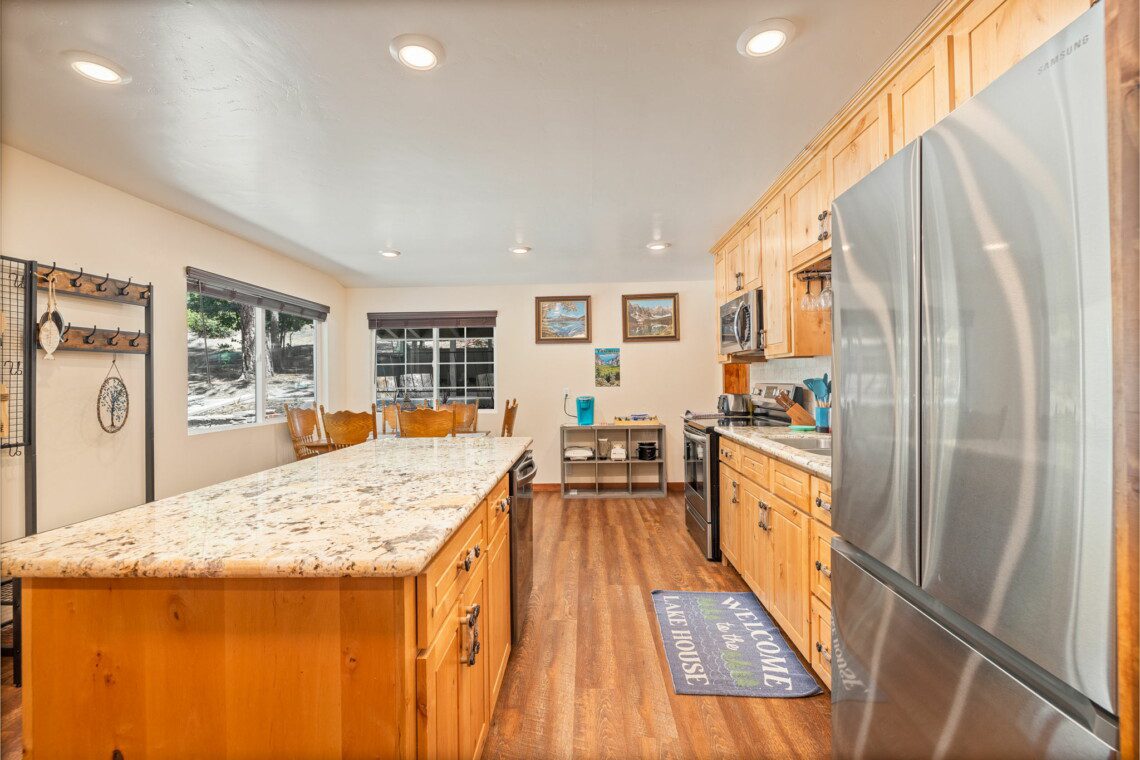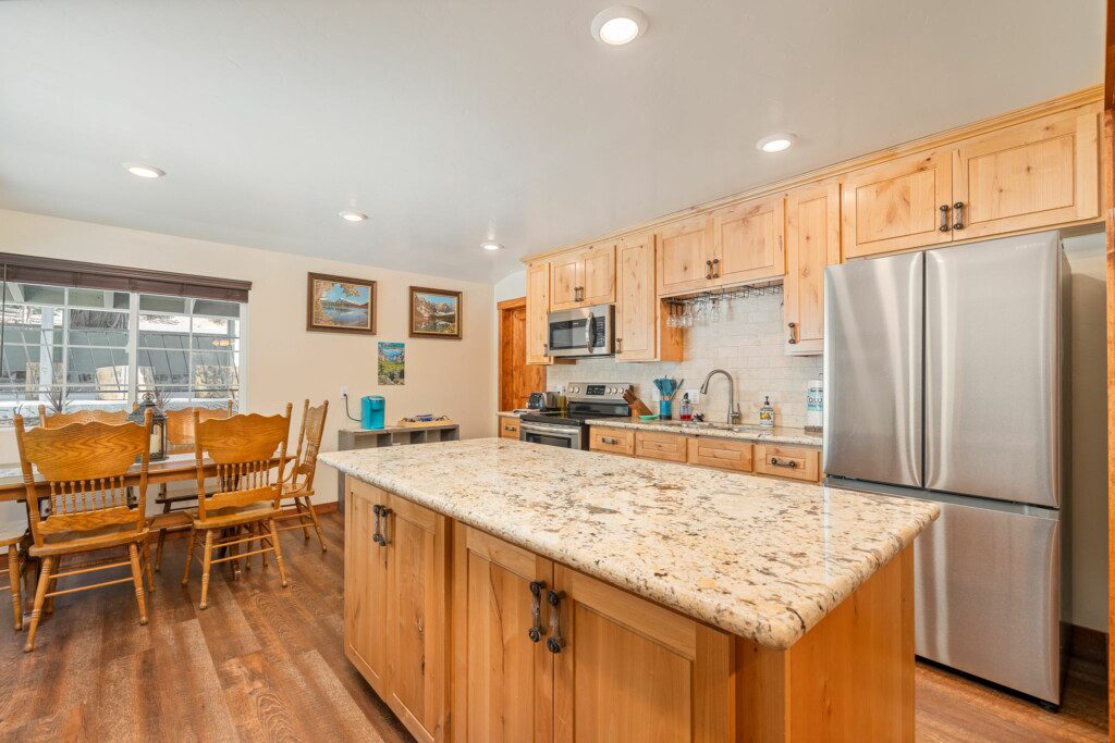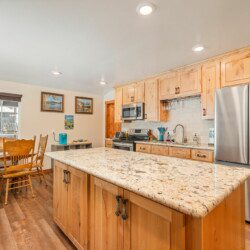 The heart of the home is the great room, where real wood interiors and a crackling fireplace create the perfect gathering space. Sip morning coffee by the fire, share stories around the large dining table, or curl up on the comfy sofas after a day outdoors. The fully equipped kitchen makes cooking simple—whether you’re preparing a quick breakfast before hitting the trails or winding down with a hearty dinner.